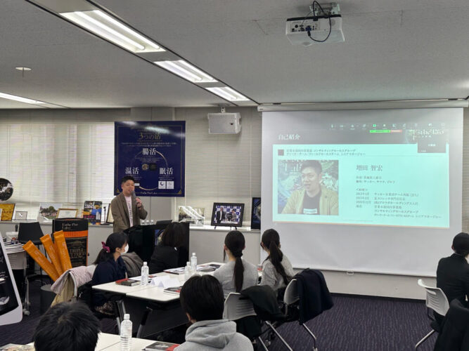 最初の会社説明は、惜しくも対面で参加が叶わなかった学生に向けてZoomを繋いで行い、増田シニアマネージャーに担当いただきました。